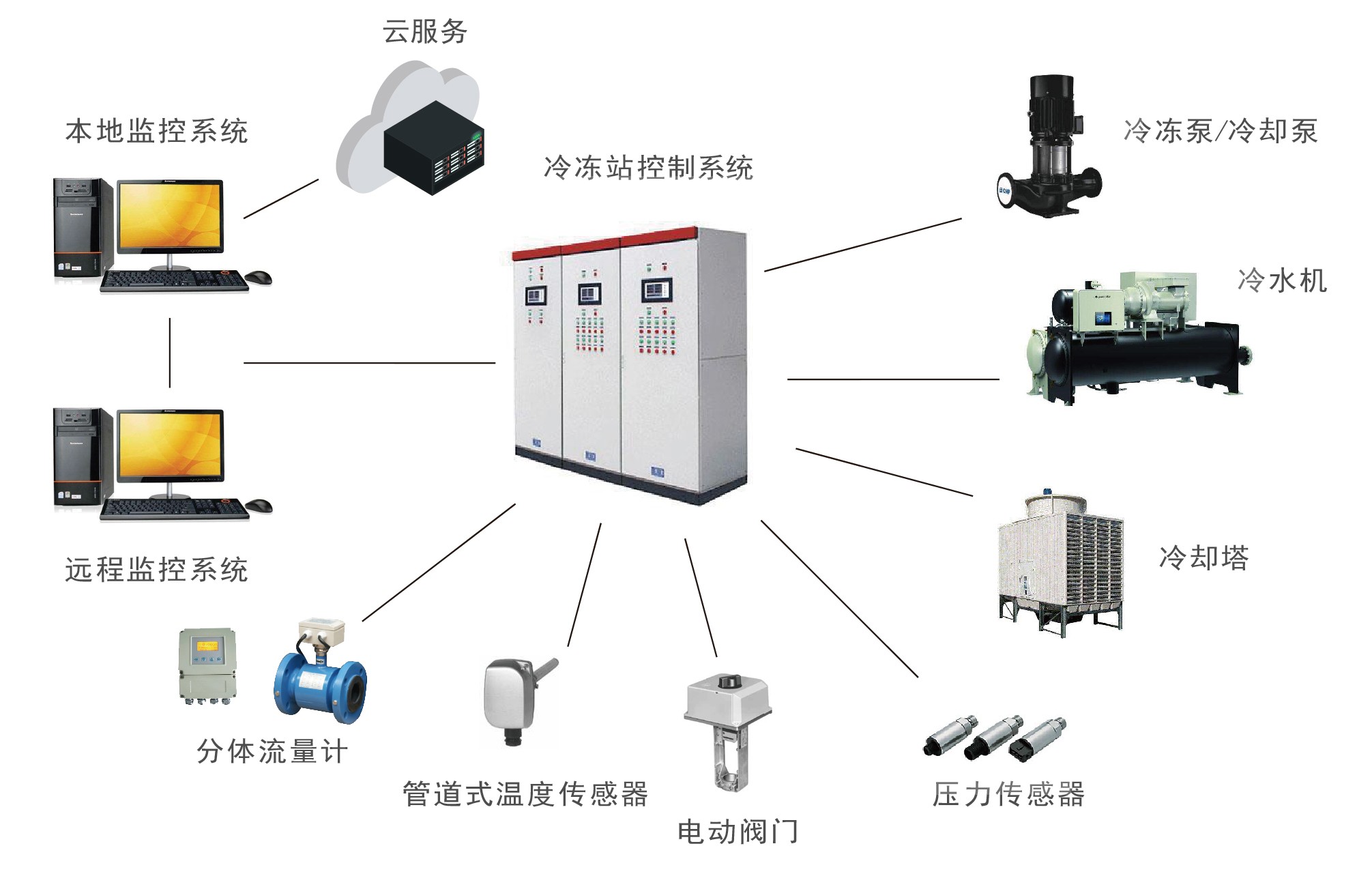 冷凍站控制系統主要應用于大型建筑空調制冷系統、工藝制冷系統、工藝冷熱交換系統等集中式冷熱源系統;可實現對冷水主機運行臺數的自動控制以及冷凍水泵、冷卻水泵、冷卻塔等設備的聯動控制和聯鎖控制,達到冷凍站無人化值守的自動化運行及高效節能運行的目標。