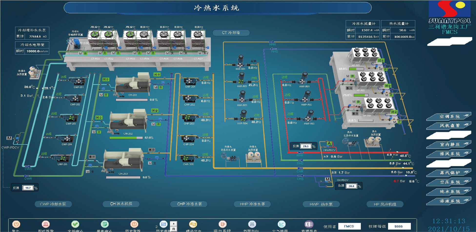 1. 豐富的現場經驗和嚴謹的軟件策略,可顯示冷凍站系統各動力設備及電動閥門間的順序啟停和聯動控制,亦可一鍵實現設備的群控,結合多年經驗的冷凍水供回水壓差溫差控制功能等。