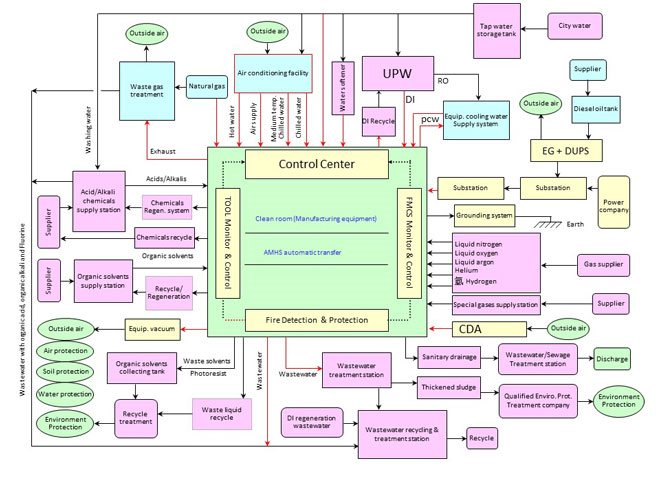 為滿足生產要求,高科技工廠的潔凈室設計了機電框架,不僅考慮到制造機器和自動化生產和運輸系統,還考慮到高潔凈度空調控制系統,防靜電裝飾,本地認證和 UL(保險商實驗室公司)的防火系統。其他系統包括用于制造、真空、化學品供應、特殊氣體供應和 FMCS(工廠監控系統)的電力、純水、工藝冷卻水和干燥的無油壓縮空氣。當這些系統協同工作時,它們可以控制潔凈室中的灰塵顆粒、溫度和濕度。潔凈室所需的支持系統如圖 所示。