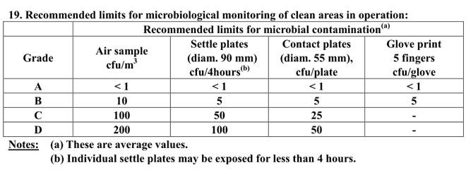 目前,制藥行業采用最廣泛的設計標準是由歐盟制定的《歐盟良好生產程序指南》(EU GGMP)。圖 5 顯示了歐盟 GGMP 中建議的空氣懸浮顆粒分類標準。下圖顯示了每種微生物污染等級的推薦限值。