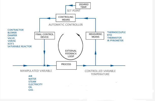 控制器將溫度信號與所需溫度(設定點)進行比較并啟動最終控制裝置。最終控制裝置改變操縱變量以改變從過程中添加或吸收的熱量。溫度控制過程中的常見操作變量是空氣、水、蒸汽、電力、石油和天然氣。