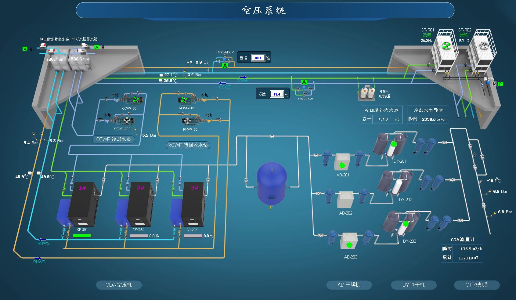 3、實現動力站一鍵啟停功能:在中控室畫面上點擊一鍵啟停按鈕,實現水閥、水泵、冰機的連鎖控制,高效控制,達到節能的目標也降低了企業管理人員數量;